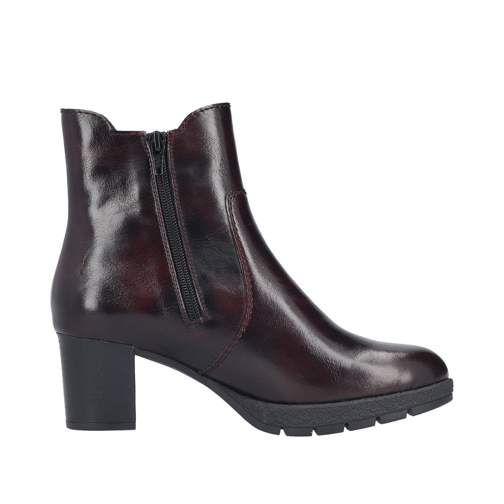 Die Rieker 77674-35 ist eine stilvolle Damen-Stiefelette mit markanter Farbgebung in Schwarz-Rot und hoher Funktionalität. Das Obermaterial aus Kunstleder gewährleistet pflegeleichte Optik und zuverlässige Alltagstauglichkeit. Im Inneren sorgt ein Samtvelour-Futter für angenehm weichen Tragekomfort. Dank der Kombination aus Reißverschluss und Elastikeinsatz gestaltet sich das An- und Ausziehen besonders einfach. Die komfortweite Passform (Weite G) bietet zusätzlichen Spielraum im Fuß- und Knöchelbereich – ideal für längeres Tragen. Der stabile Blockabsatz mit etwa 55 mm Höhe und eine griffige Sohle gewährleisten sicheren Halt auch auf glatten Untergründen. Ein perfektes Modell für Damen, die Komfort und Stil gleichermaßen suchen.