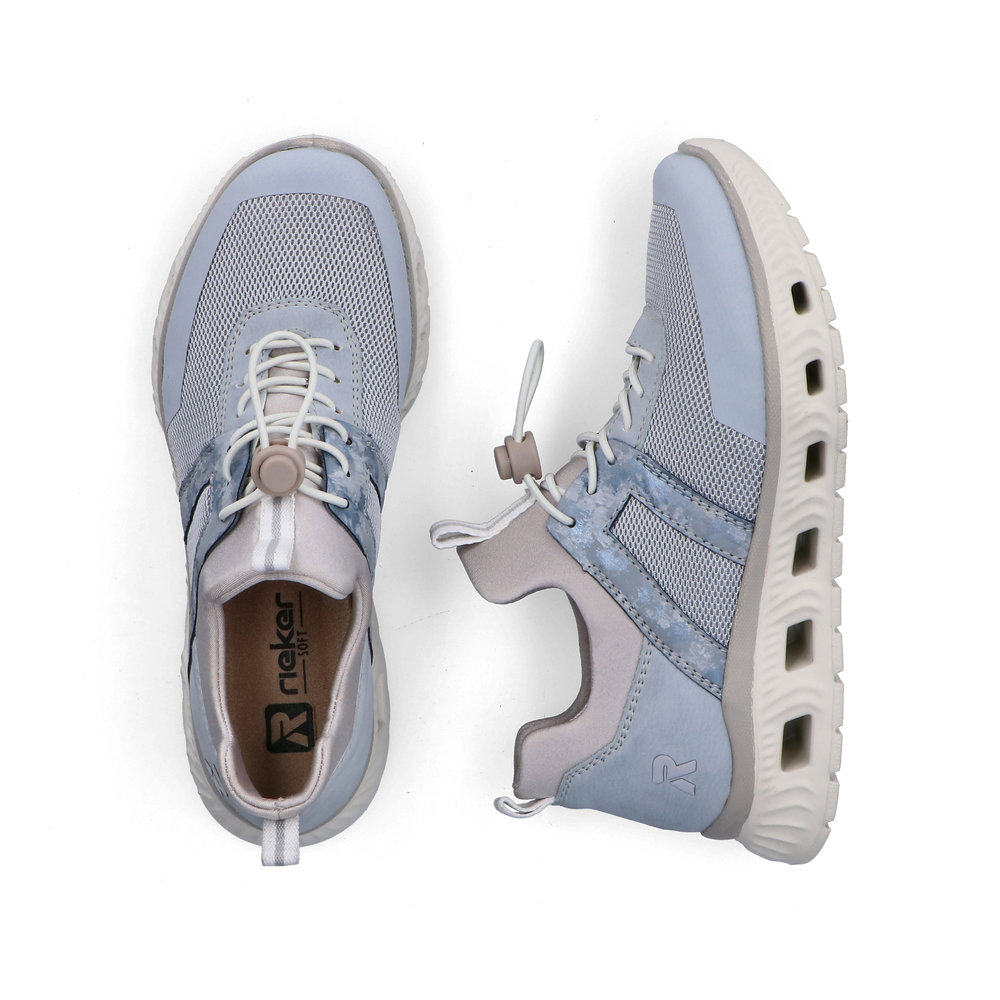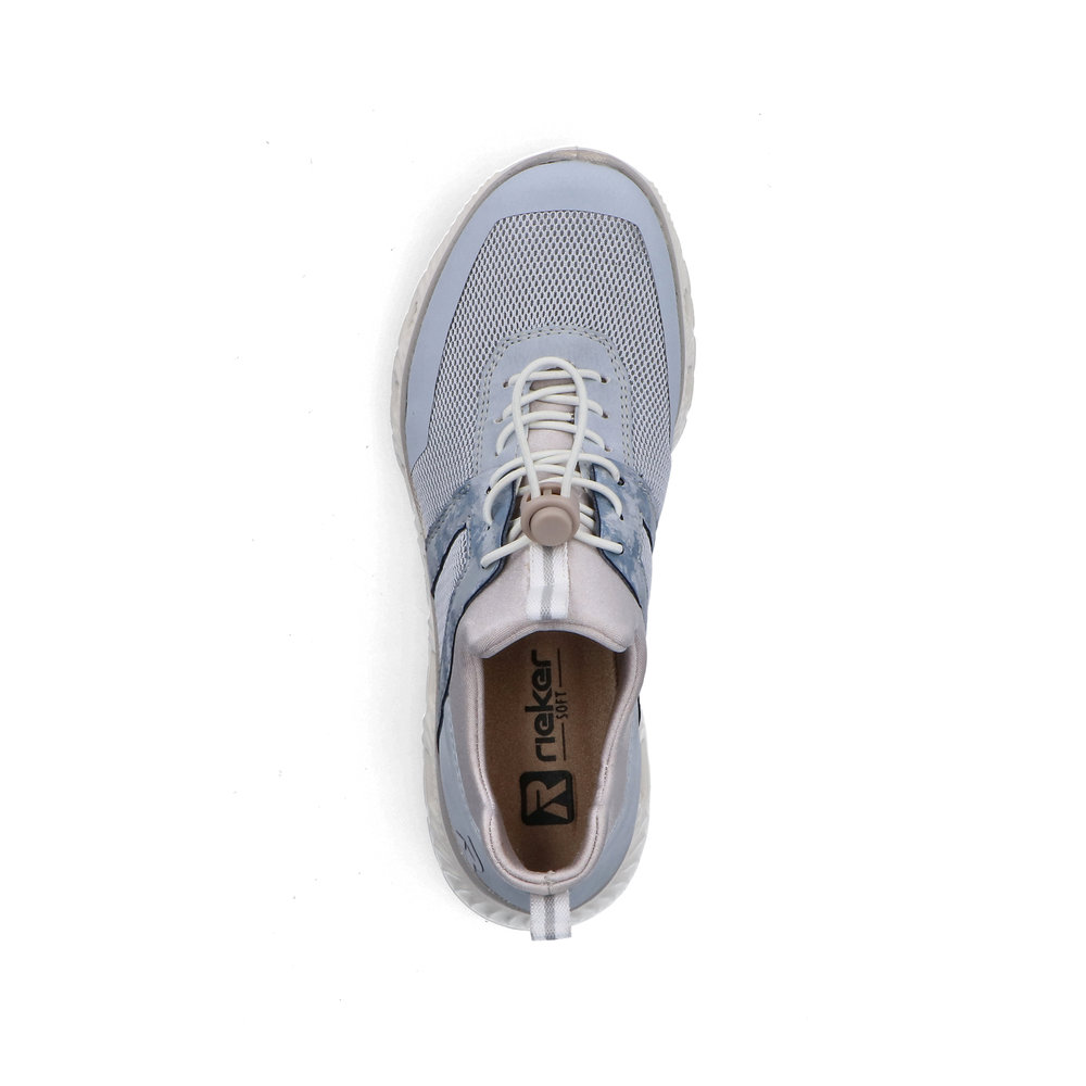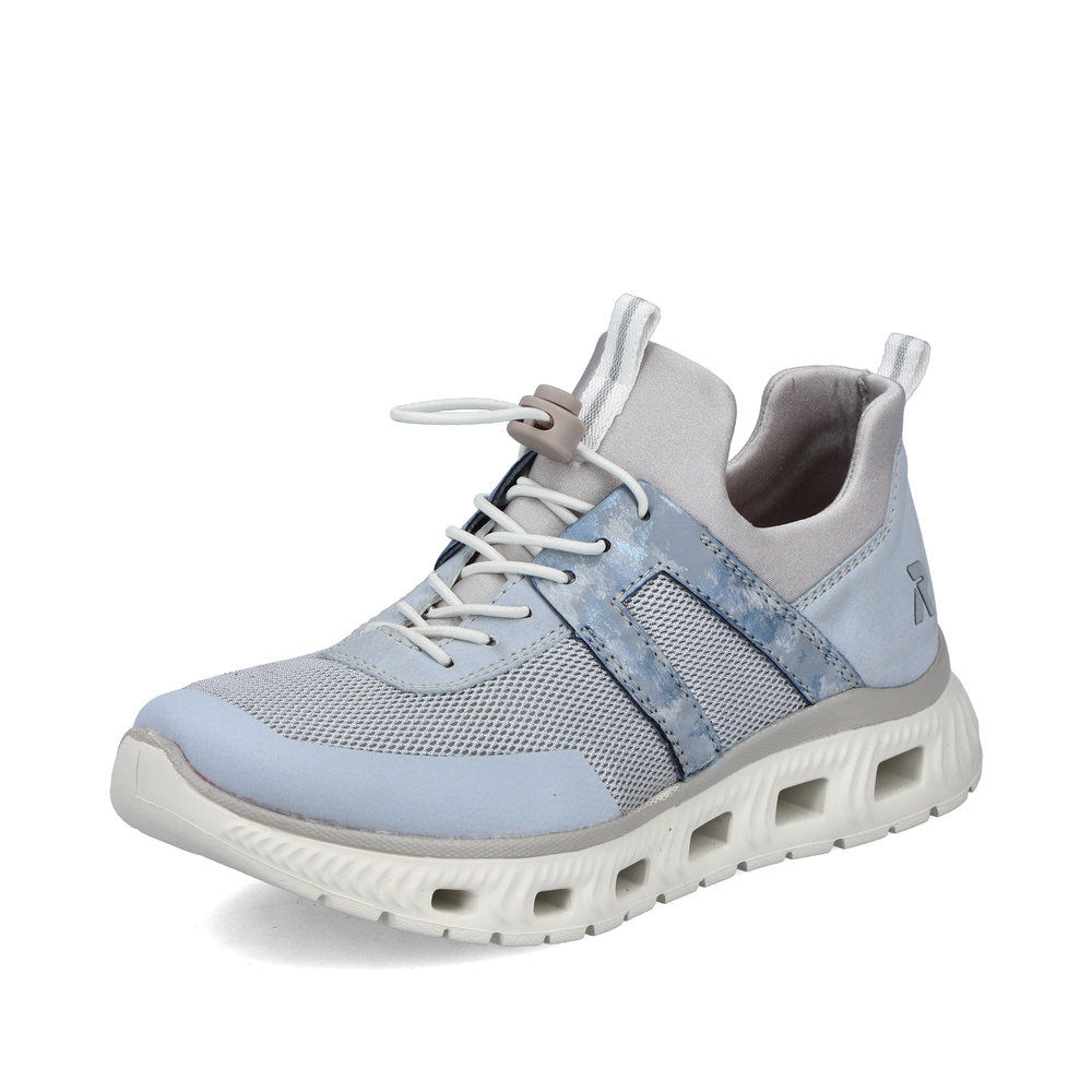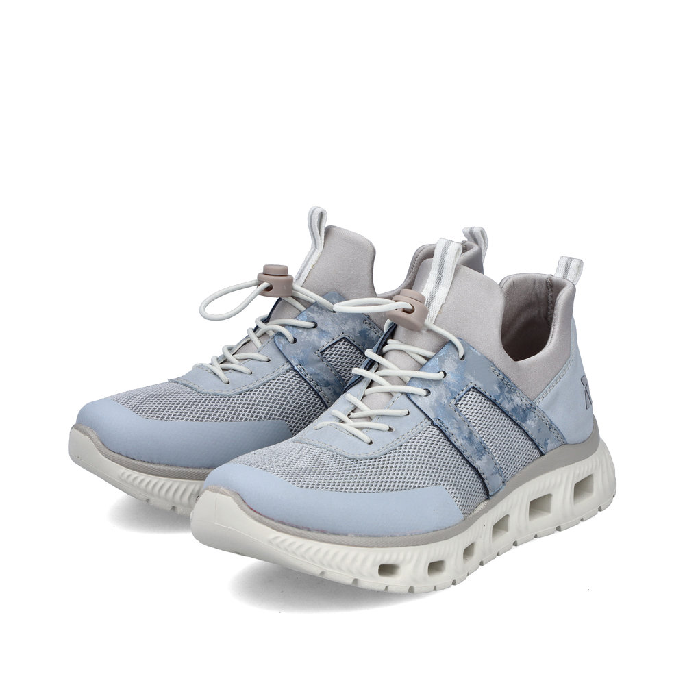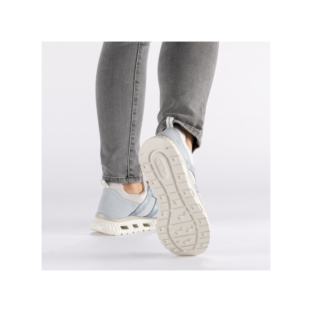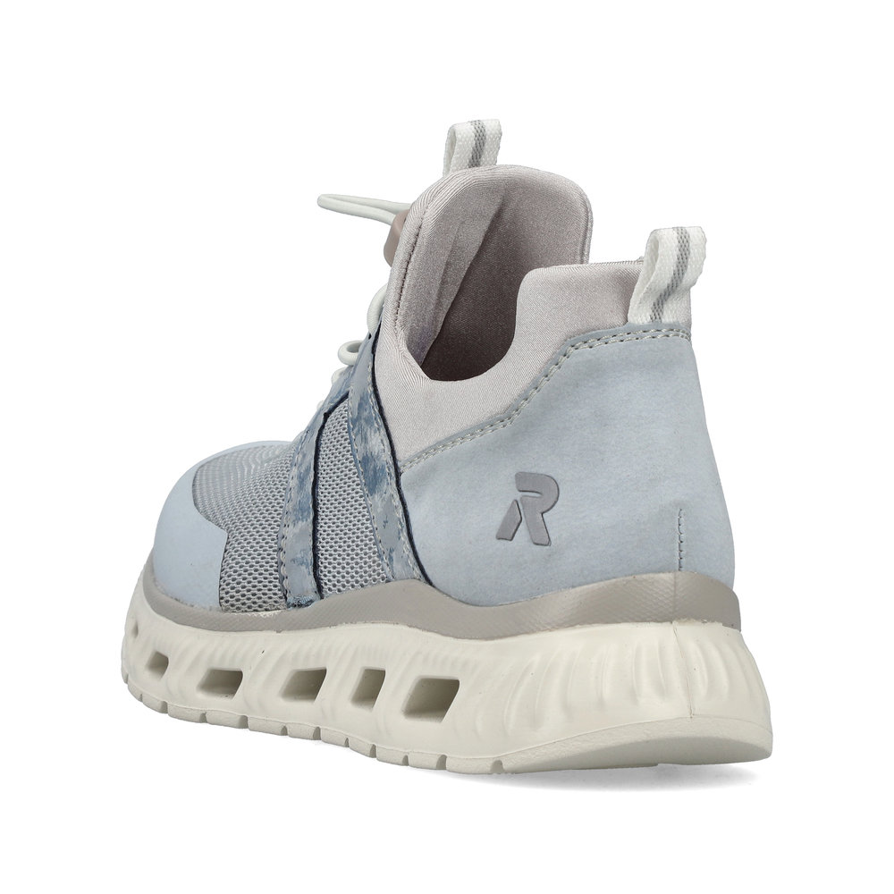 Der Rieker M6061-12 ist ein moderner Damen-Sneaker in elegantem Blaugrau. Das Obermaterial kombiniert textile und synthetische Elemente und sorgt für ein leichtes, angenehmes Tragegefühl.