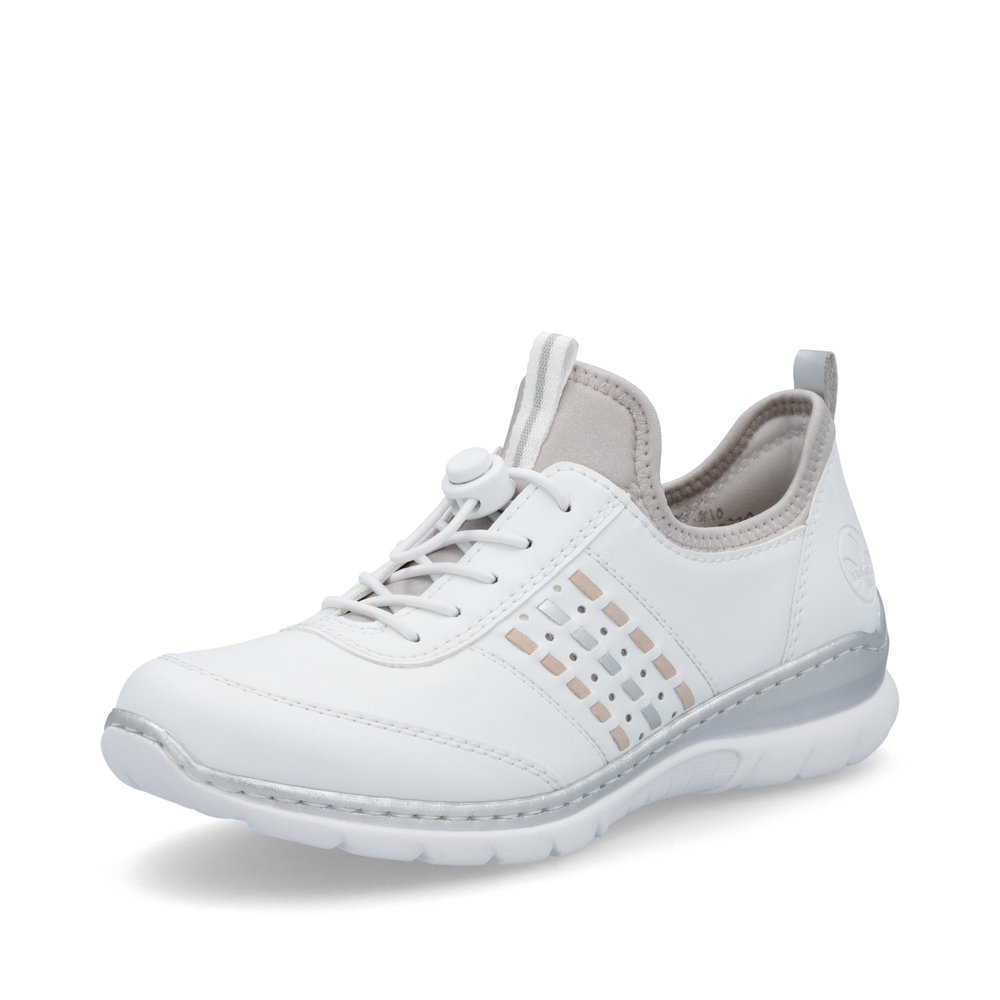 Der Rieker L3259-80 ist ein leichter Damen-Sneaker in klassischem Weiß, der durch hohen Tragekomfort und unkomplizierten Einstieg überzeugt. Statt einer klassischen Schnürung verfügt der Schuh über eine elastische Gummischnürung, die sich flexibel an den Fuß anpasst und das An- und Ausziehen erleichtert.