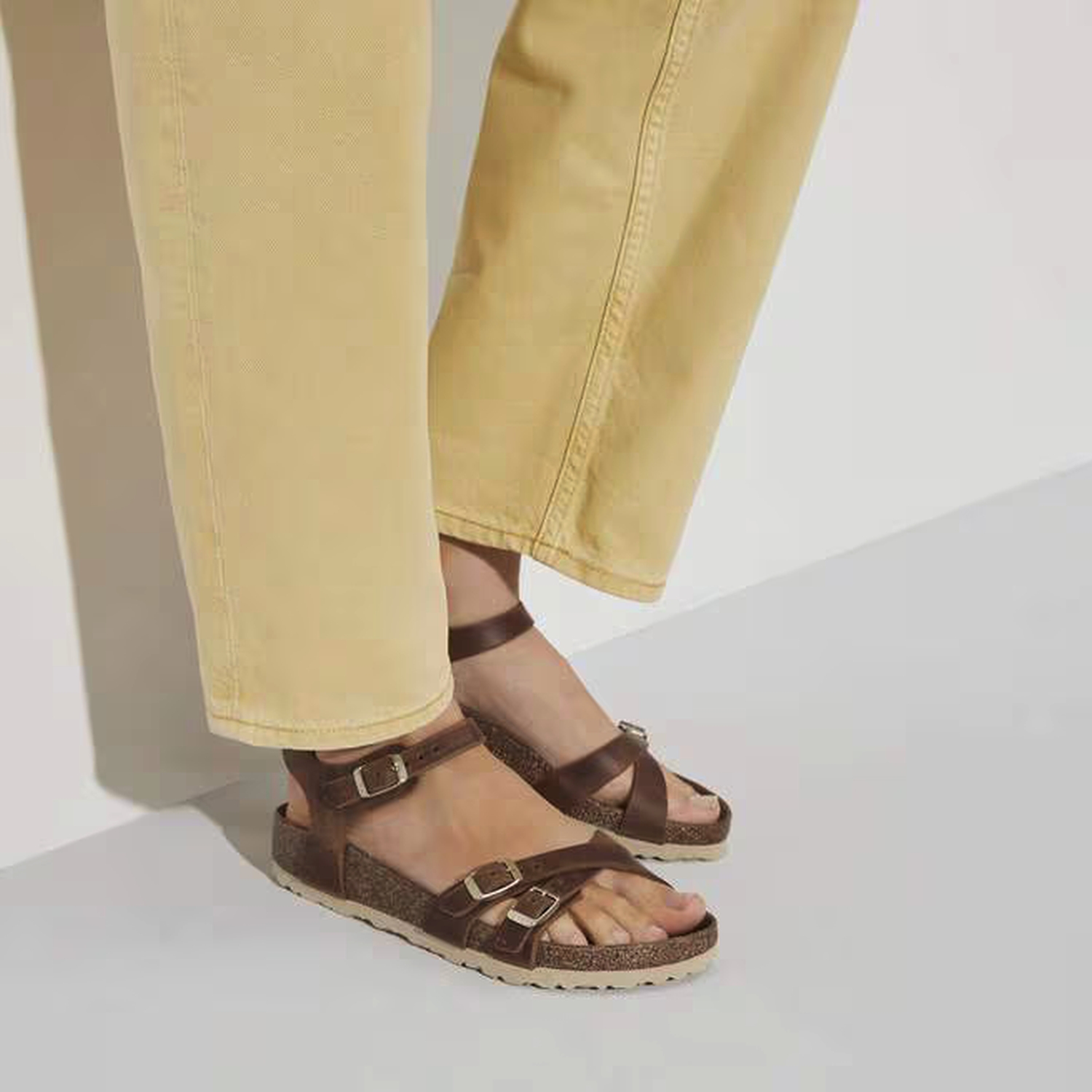 Die Birkenstock Kumba 1021509 ist eine elegante Damen-Sandale mit überkreuzten Riemen und Fersenriemen für sicheren Halt. Das geölte Nubukleder sorgt für eine natürliche Optik und entwickelt mit der Zeit eine individuelle Patina.