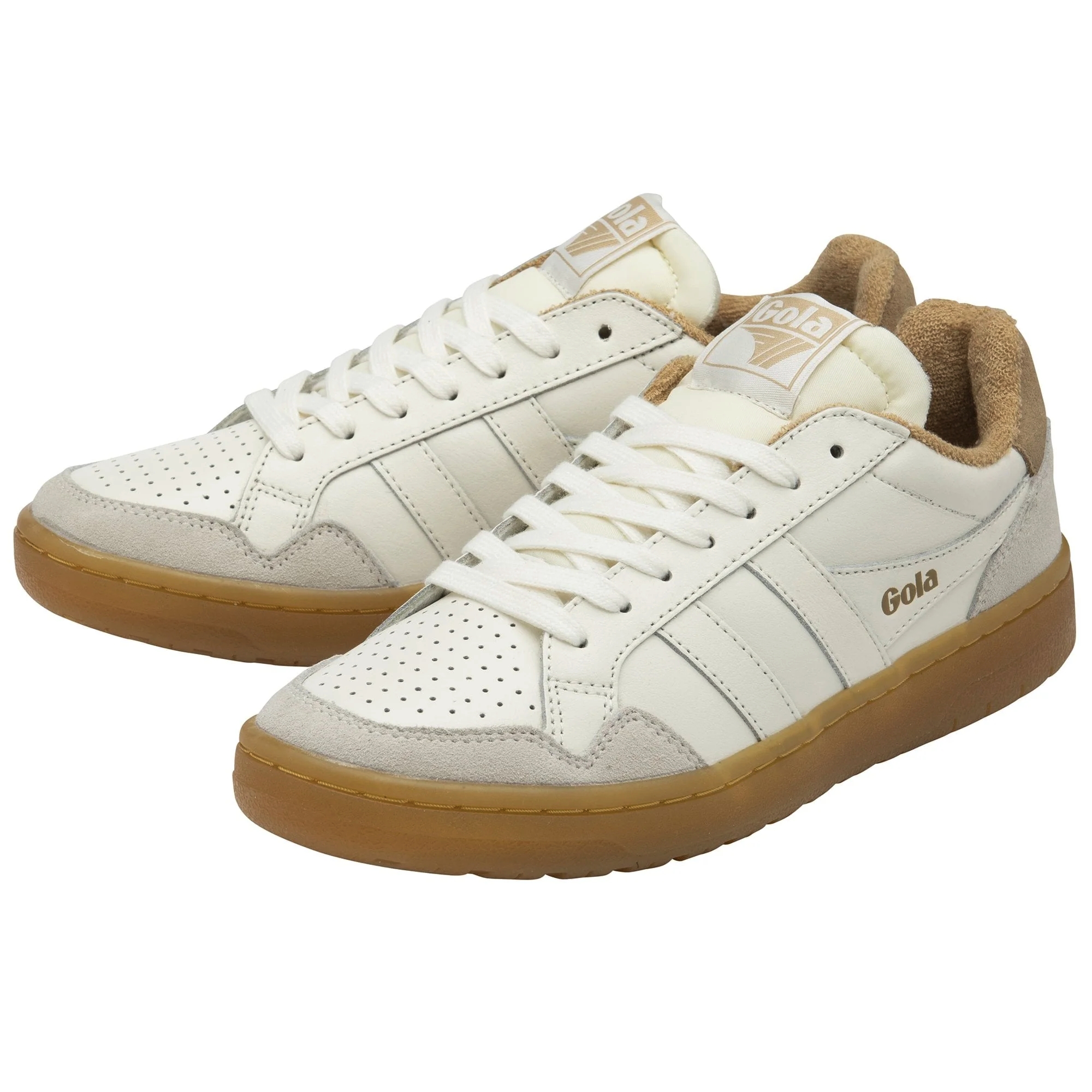 Der Gola Eagle 86 CMB572AE ist ein stilvoller Damen-Sneaker im klassischen Court-Design mit Retro-Charakter. Das hochwertige Obermaterial in der Farbkombination Off White und Light Caramel sorgt für eine elegante und zugleich sportliche Optik.