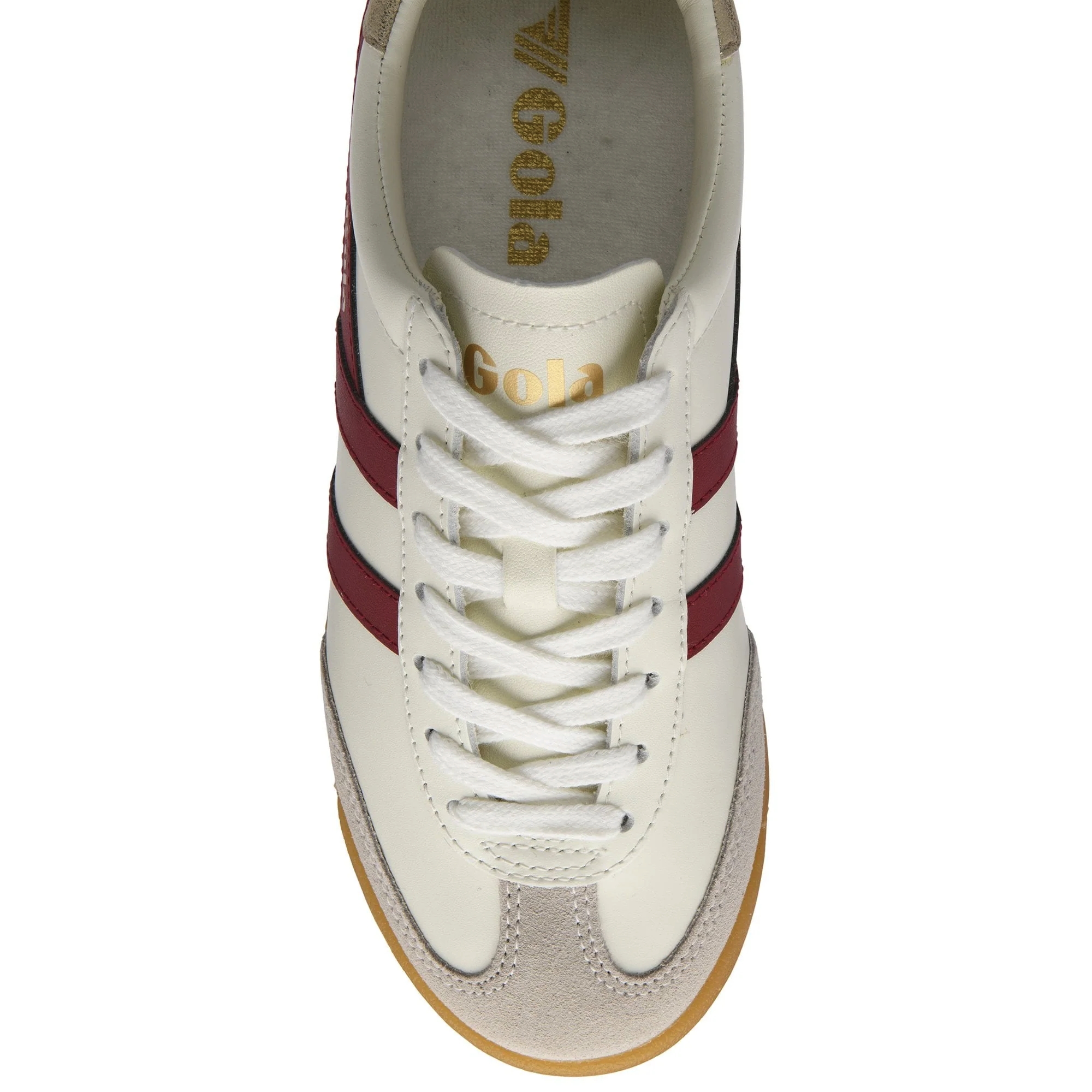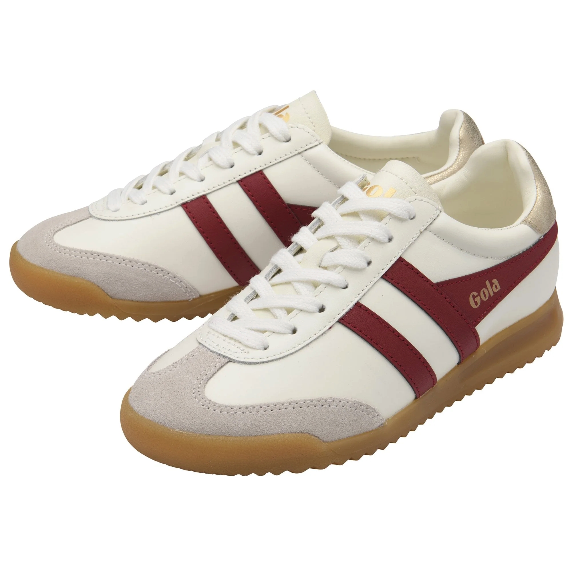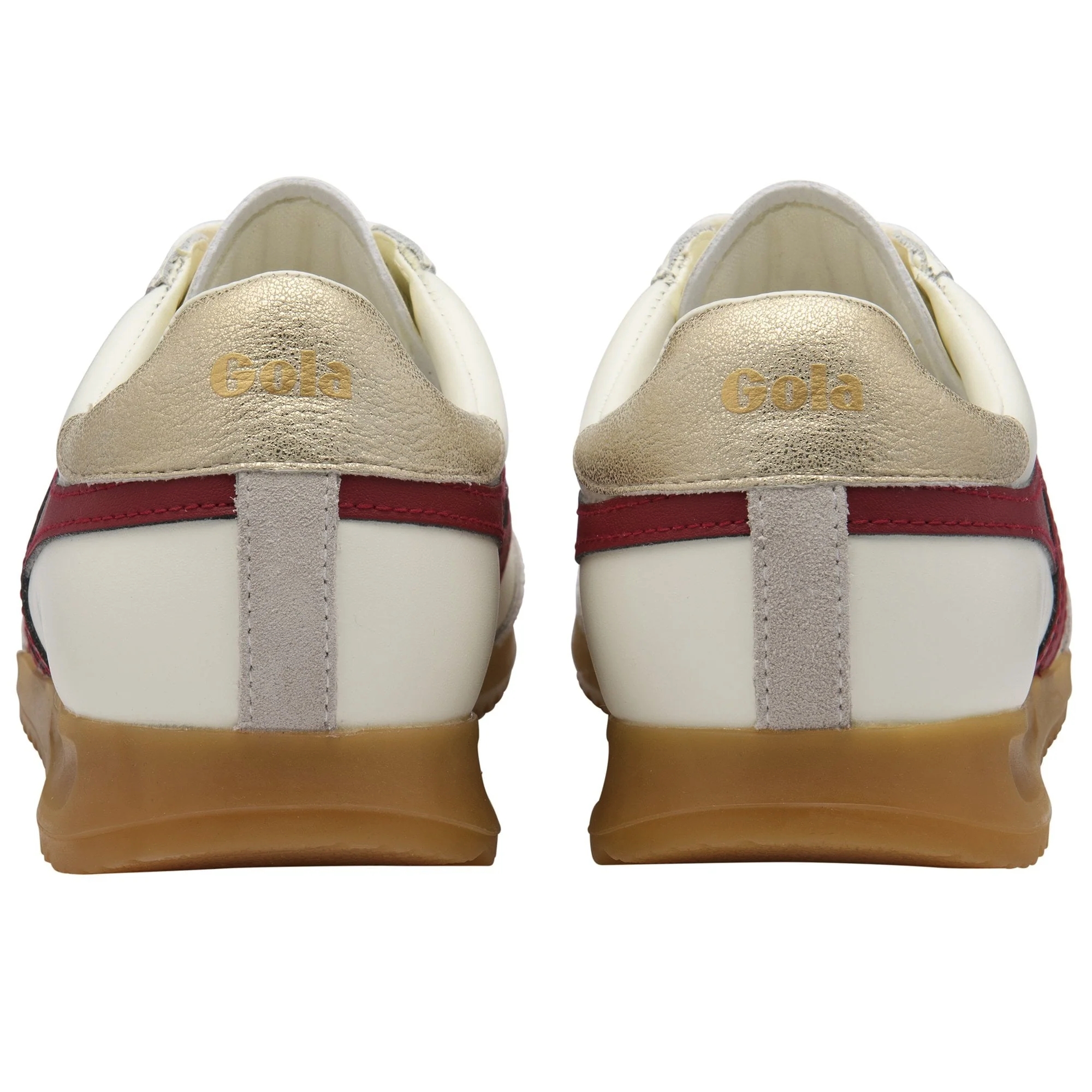 Der Gola Torpedo Leather ist ein klassischer Damen-Sneaker im authentischen Retro-Stil. Das hochwertige Leder-Obermaterial in der Farbkombination Off White, Deep Red und Gold sorgt für eine stilvolle und zugleich sportliche Optik.