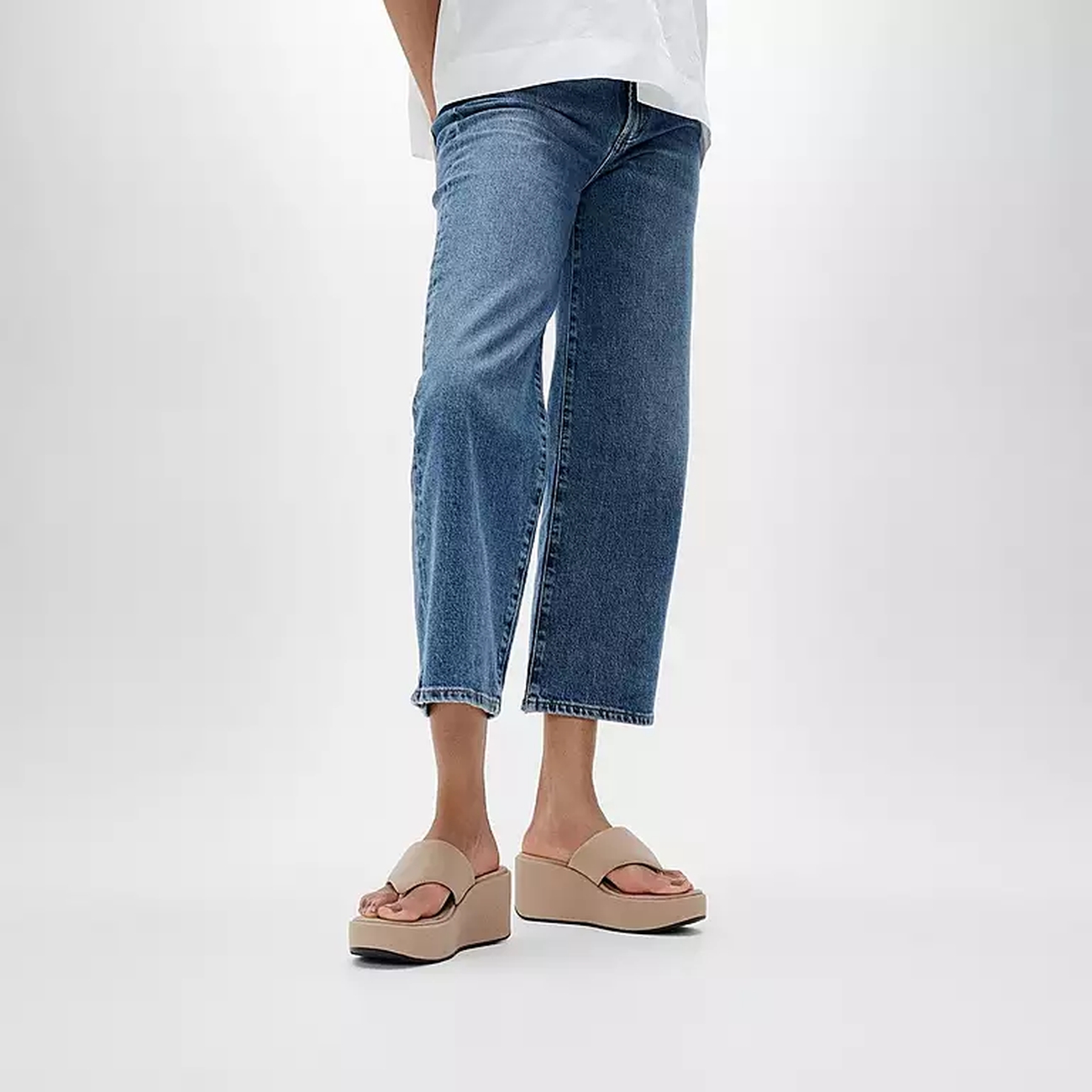 Der FitFlop Platfform Denim Wedge Toe-Post Sandals A5H-D71 kombiniert modernes Design mit hohem Tragekomfort. Das Obermaterial aus Denim-Textil sorgt für eine lässige, stilvolle Optik und macht den Schuh zum idealen Begleiter für warme Tage. Die markante Keilabsatz-Silhouette verleiht dem Modell eine feminine Höhe, ohne auf Stabilität zu verzichten. Die integrierte CushX™ Technologie wurde speziell für Plattform-Modelle entwickelt und unterstützt die natürliche Körperhaltung sowie ein komfortables Laufgefühl. Das ergonomisch geformte Fußbett bietet gezielte Unterstützung im Fußgewölbe und reduziert den Druck beim Gehen. Die leichte und stabile Konstruktion sorgt für angenehmen Tragekomfort auch bei längeren Strecken. Die robuste Gummilaufsohle bietet sicheren Halt auf unterschiedlichen Untergründen und rundet das Modell funktional ab.