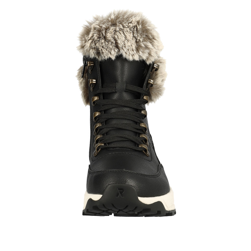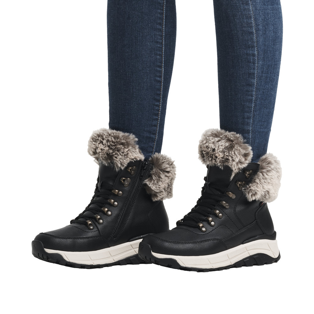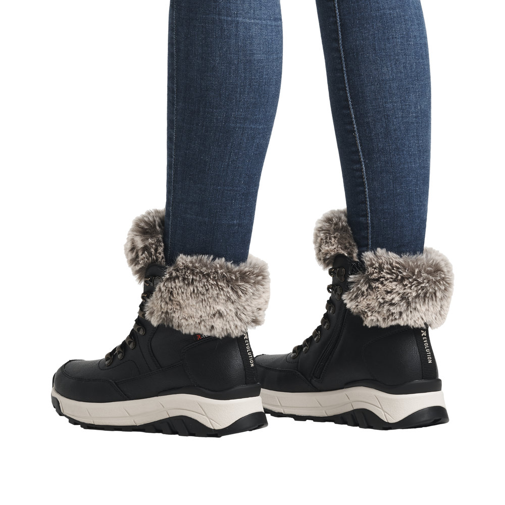 Echter Klassiker - modern interpretiert: Mit diesen schwarzen Stiefeln aus Glattleder von Rieker EVOLUTION musst du dir um die Tücken des Winterwetters keine Sorgen machen. Die clevere Kombination aus Schnürung und Reißverschluss gibt optimalen Halt und ermöglicht ein einfaches An- und Ausziehen. Die flexible und super leichte Sohle sorgt für ein angenehmes Tragegefühl. Ein funktionales und komfortables Plus ist die gepolsterte und herausnehmbare Einlegesohle. Funktionale Features statten den Schuh optimal gegen die winterlichen Witterungsverhältnisse und Kälte aus. Kuschelige und sehr warme Schurwolle macht diesen Stiefel zum optimalen Begleiter perfekt für nass-kalte Tage. Anziehen und ins Abenteuer stürzen!