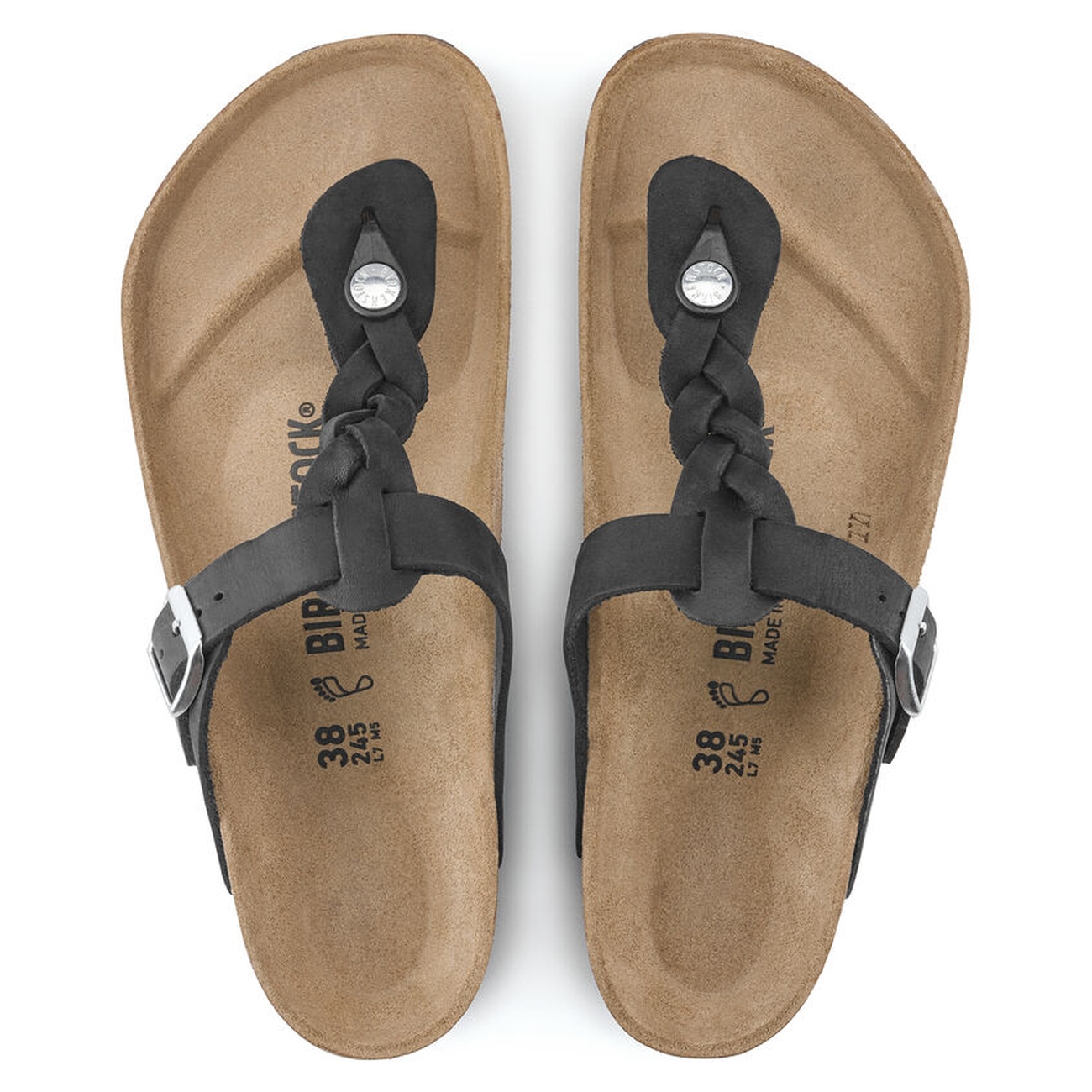 Der Birkenstock Gizeh Braided FL 1021349 ist eine Damen-Sandale, die klassischen Komfort mit modernem Design vereint. Gefertigt aus hochwertigem geöltem Leder, bietet der Riemen eine angenehme Haptik und entwickelt mit der Zeit eine individuelle Patina. Das anatomisch geformte Kork-Latex-Fußbett sorgt für optimale Fußunterstützung, Dämpfung und höchsten Tragekomfort, auch bei langen Tragezeiten. Die Sohle ist leicht, flexibel und rutschfest, sodass die Sandale bequem den ganzen Tag getragen werden kann. Mit dem verstellbaren Metallriegelverschluss lässt sich die Sandale individuell anpassen und ist der ideale Begleiter für Alltag, Freizeit und City-Looks. Made in Germany, nachhaltig produziert – perfekt für Damen, die Wert auf Stil, Komfort und Qualität legen.
